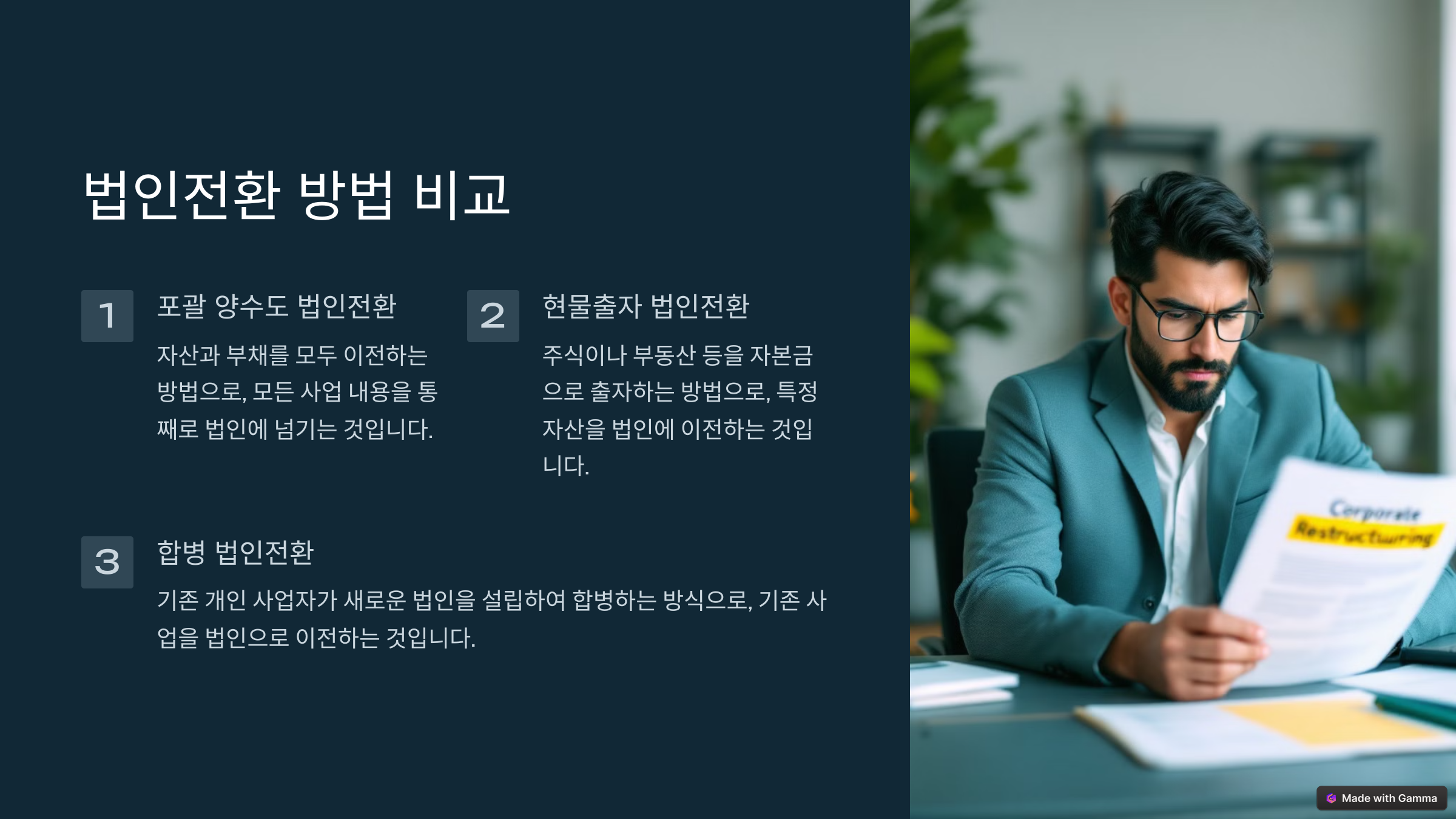 | 현물출자 | 개인사업자의 자산을 법인에 현물로 출자 | 자산을 법인으로 그대로 이전 가능 | 절차가 복잡하고 비용이 발생 |