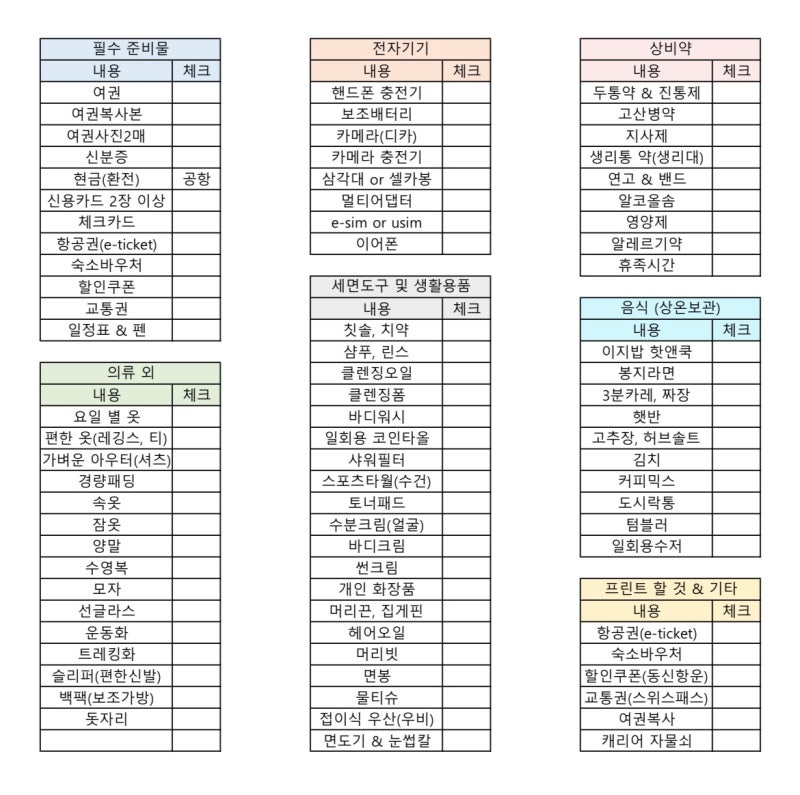 - 의류 및 개인 용품: 날씨에 맞는 옷, 속옷, 양말, 외투, 세면도구, 화장품, 개인 위생 용품