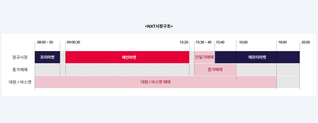 넥스트레이드는 오전 8시부터 밤 20시 00분까지 운영되며, 이는 기존 KRX의 거래 시간(오전 9시~오후 3시 30분)보다 두 배 이상 깁니다.