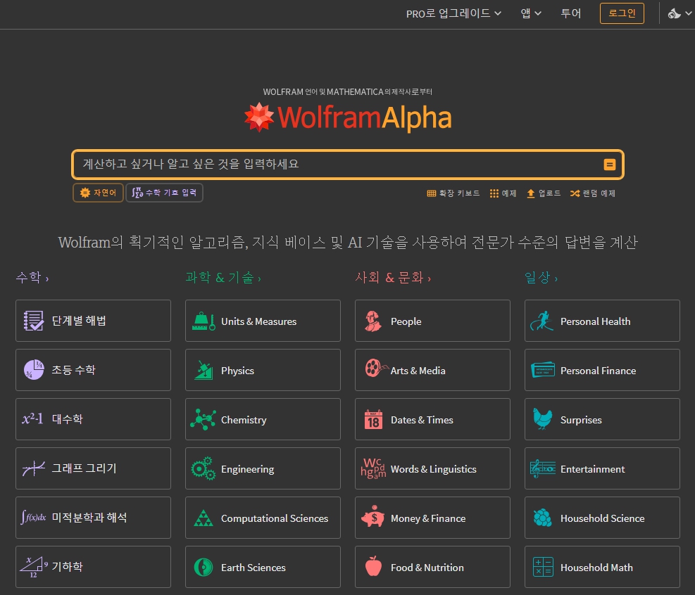 Wolfram Alpha는 과학, 수학, 통계, 일반 지식 등에 대한 상세한 정보를 제공하는 AI 검색 엔진입니다.