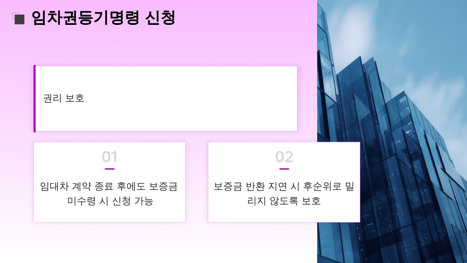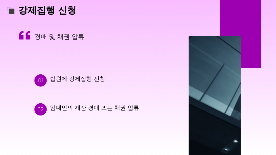 - 강제 집행 신청임대인의 재산(예금, 부동산 등)에 대한 강제 집행을 신청할 수 있습니다.