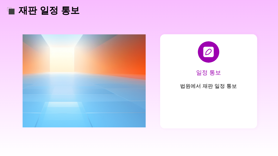 - 재판 일정 통보법원에서 접수하면 재판 일정이 문자 또는 우편으로 통보됩니다.