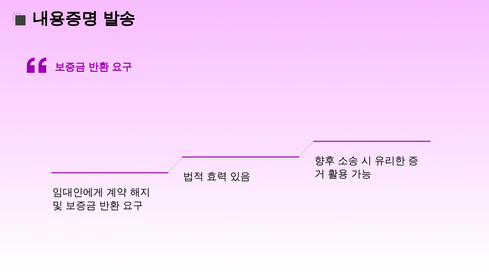 내용증명 우편을 통해 임대인에게 정식으로 보증금 반환을 요청하는 것이 첫 단계입니다. 법적인 효력이 강하지는 않지만, 소송 시 증거 자료로 활용할 수 있습니다.