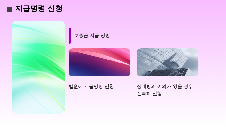 | 급여/예금 압류 | 임대인의 은행 계좌 또는 급여를 압류하여 보증금을 회수 |