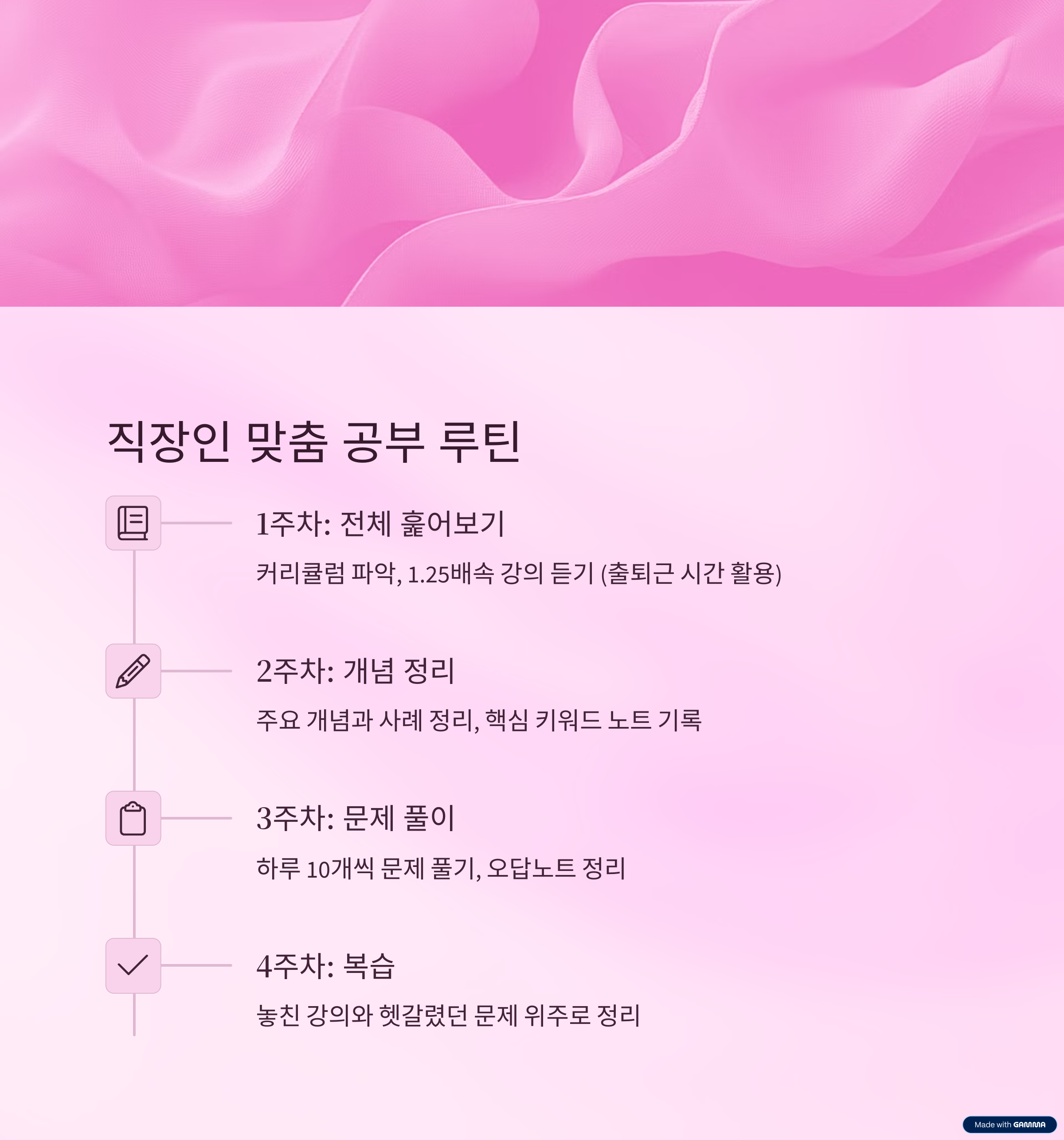 넷째 주에는 복습 위주로 진행하며 놓쳤던 강의와 헷갈렸던 문제 위주로 다시 보고 정리해요. 시험은 이해 중심이라 너무 암기하려 하지 않아도 돼요.