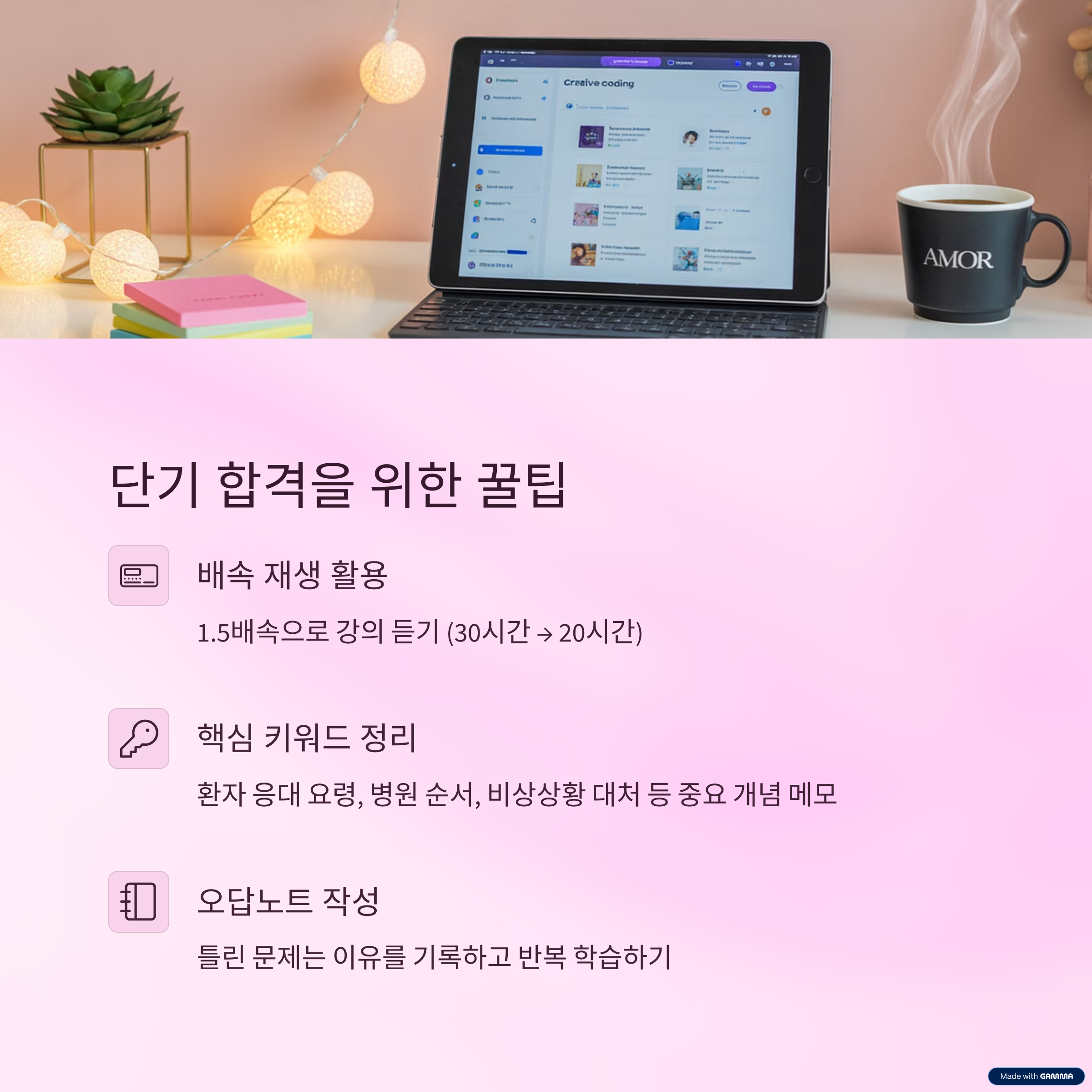 두 번째로, 강의 들으며 핵심 키워드는 따로 적어두세요. 예를 들어 '환자 응대 요령', '병원 순서', '비상상황 대처' 같은 건 시험에 자주 나와요.