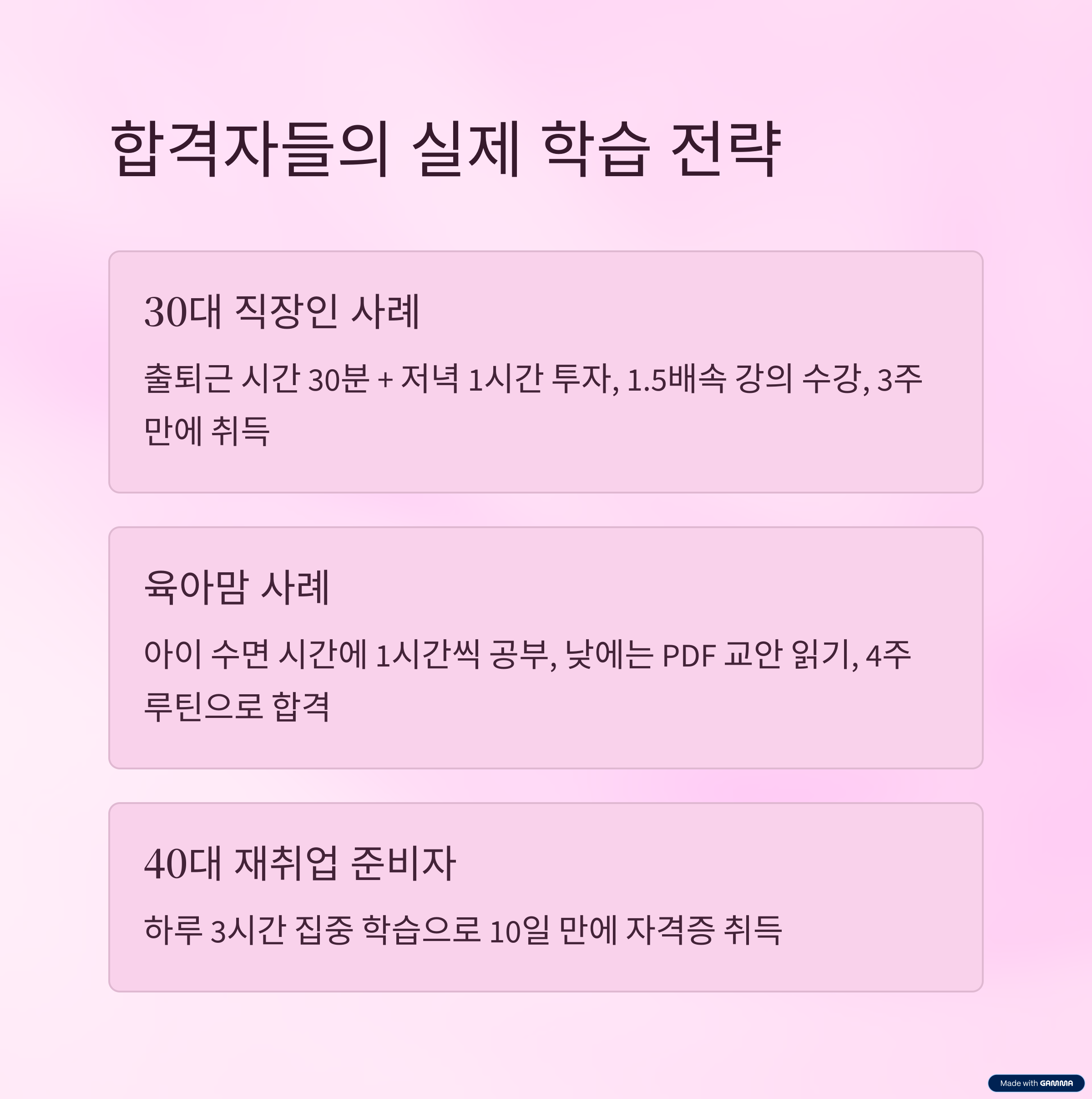 30대 직장인 A씨는 매일 출퇴근 시간 30분과 저녁 1시간을 투자해 3주 만에 자격증을 취득했어요. 주로 온라인 강의를 1.5배속으로 수강하고, 자기 전에 문제를 풀었대요.