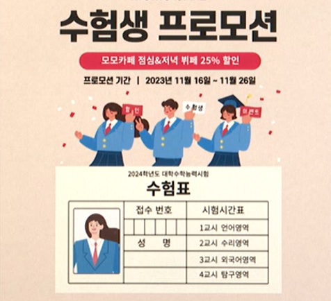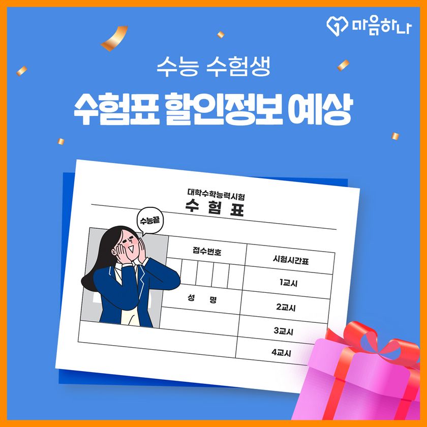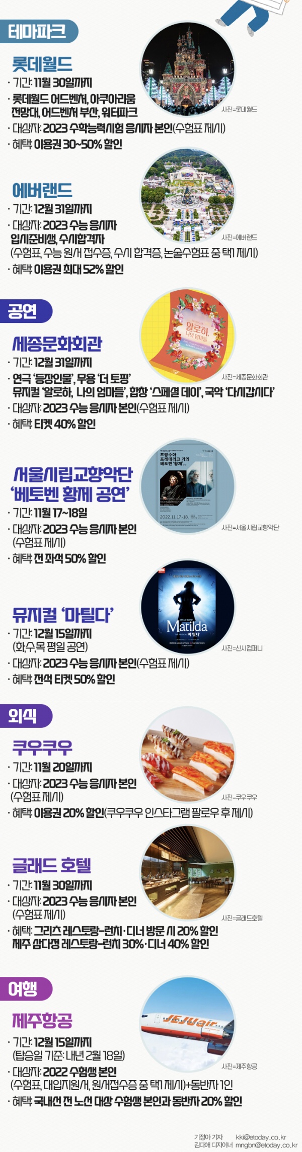 수험생 여러분, 긴 시간 동안 공부와 노력에 매진하며 정말 수고 많으셨습니다! 이번 수능을 마치며 한 단계 성장한 여러분에게는 그간의 노력을 보상받을 자격이 있습니다. 다가오는 휴식 기간 동안 다양한 기업에서 제공하는 특별 할인 혜택을 통해 즐거운 경험을 만끽해 보세요. 테마파크, 전자제품, 영화관, 음식점 할인부터 여행 및 문화 행사에 이르기까지 폭넓은 혜택 정보를 정리했습니다. 이번 기회를 통해 잊지 못할 추억을 만들어 보세요.