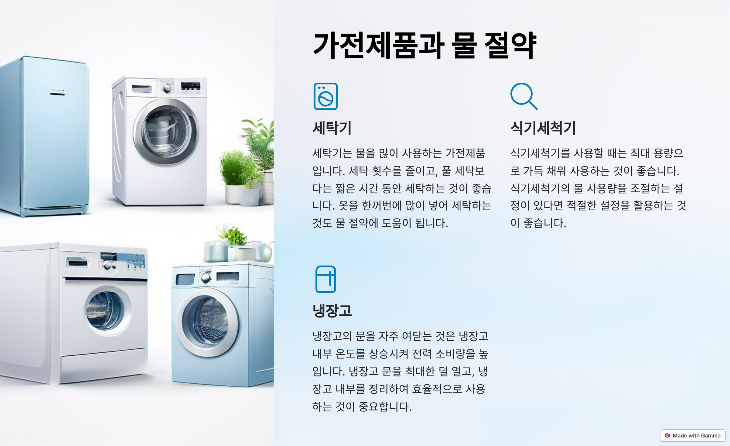 효율적인 가전제품 사용으로 가정 내 물 사용량을 줄일 수 있습니다.