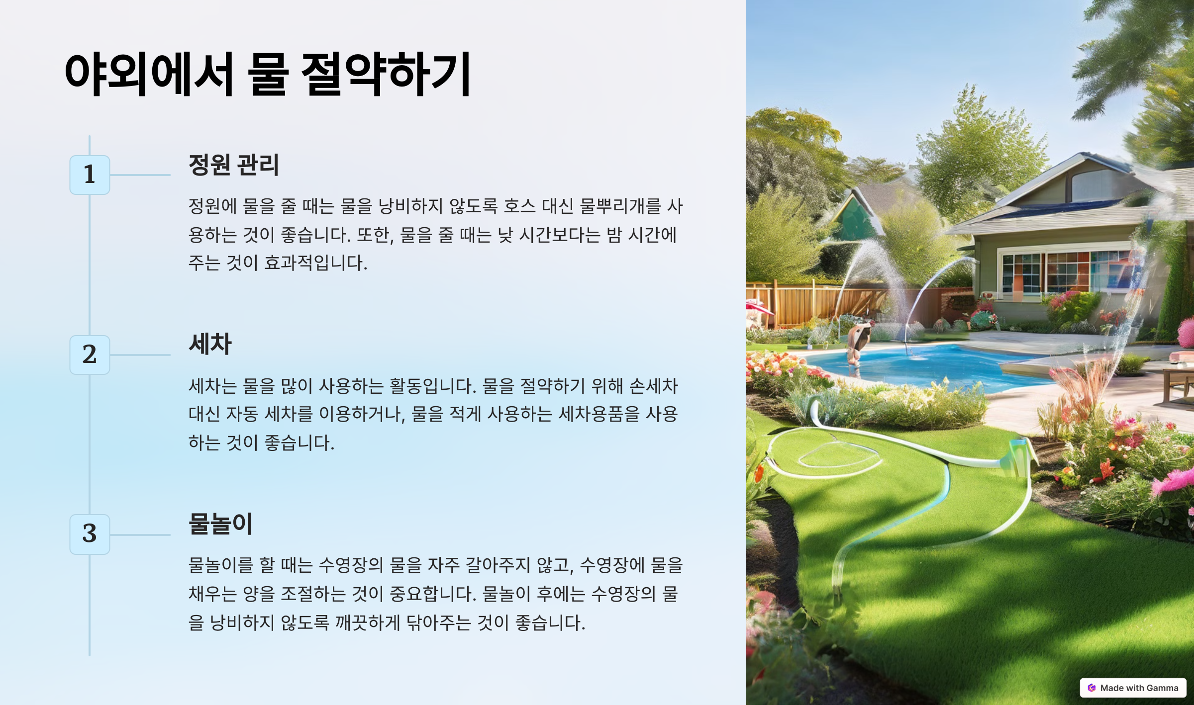 이러한 방법으로 가정 외부에서도 물 절약 효과를 높일 수 있습니다.
