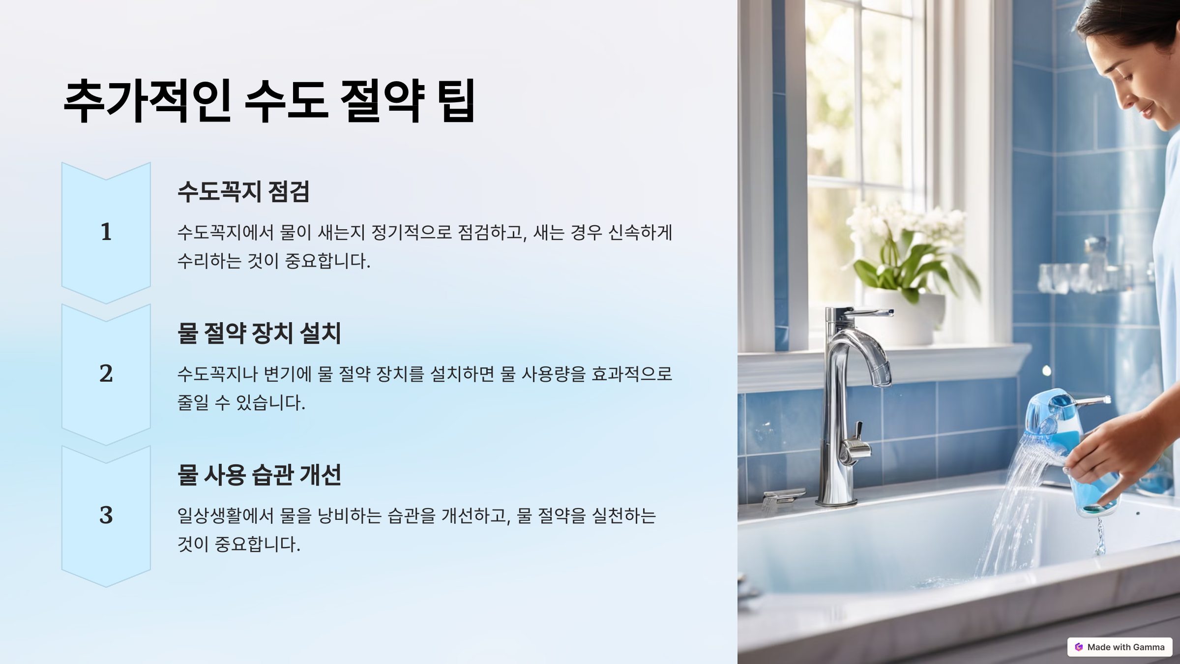 위에서 소개한 방법들을 실천해 매달 수도요금에서 눈에 띄는 변화를 경험해 보세요.
