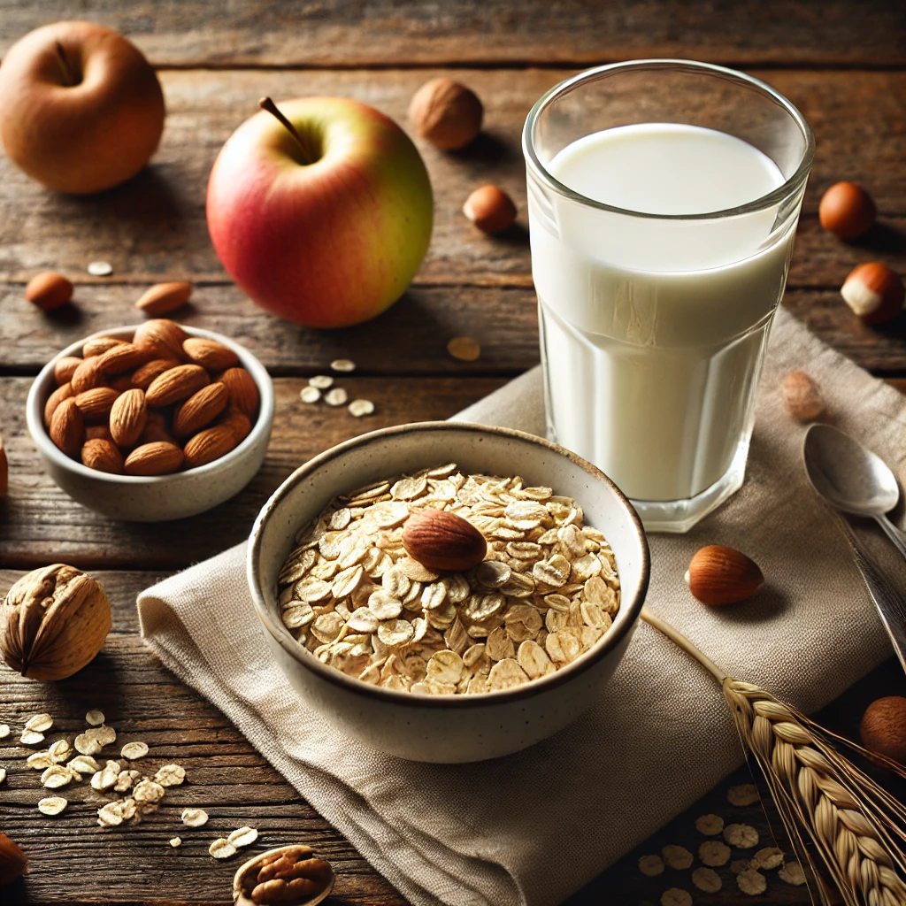 - 오트밀 30g + 저지방 우유 200ml + 견과류 10g