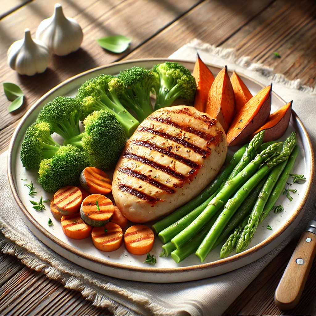 - 닭가슴살 스테이크 + 데친 채소 + 고구마