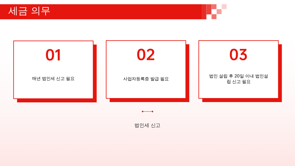 법인은 **법인세, 부가가치세, 원천징수세** 등을 정기적으로 신고해야 합니다. 세무 신고를 놓치면 가산세가 부과될 수 있으므로 전문가의 도움을 받는 것이 좋습니다.