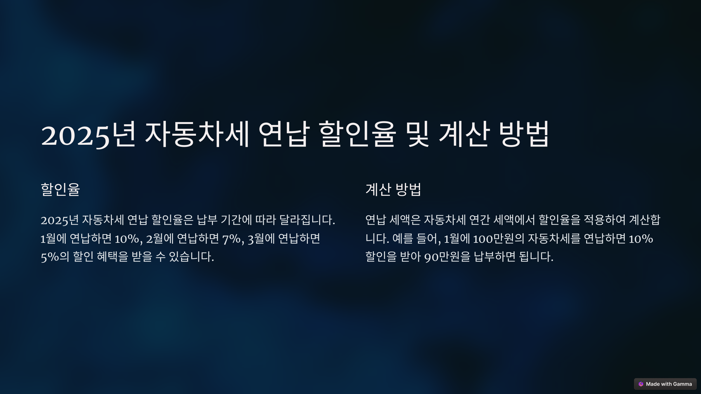 2025년에는 4.6%의 할인율이 적용되어, 연납을 통해 적지 않은 금액을 절약할 수 있습니다. 특히 대형 차량이나 고배기량 차량 소유자에게는 절감 효과가 더욱 두드러집니다.