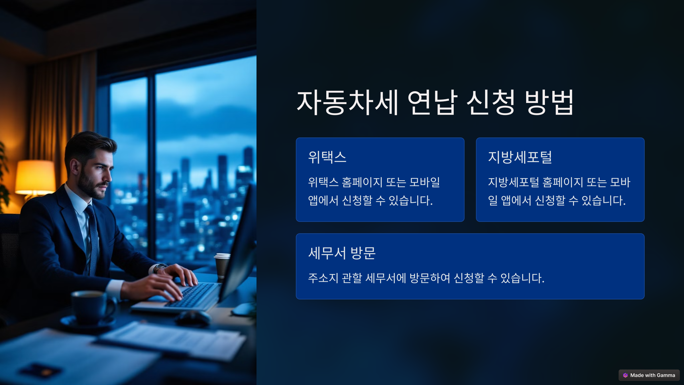 자동차세 연납은 온라인과 오프라인 모두 신청할 수 있습니다. 온라인 신청은 **위택스(Wetax)**를 통해 간단히 진행할 수 있으며, 오프라인 신청은 차량 등록지 관할 구청에서 가능합니다.