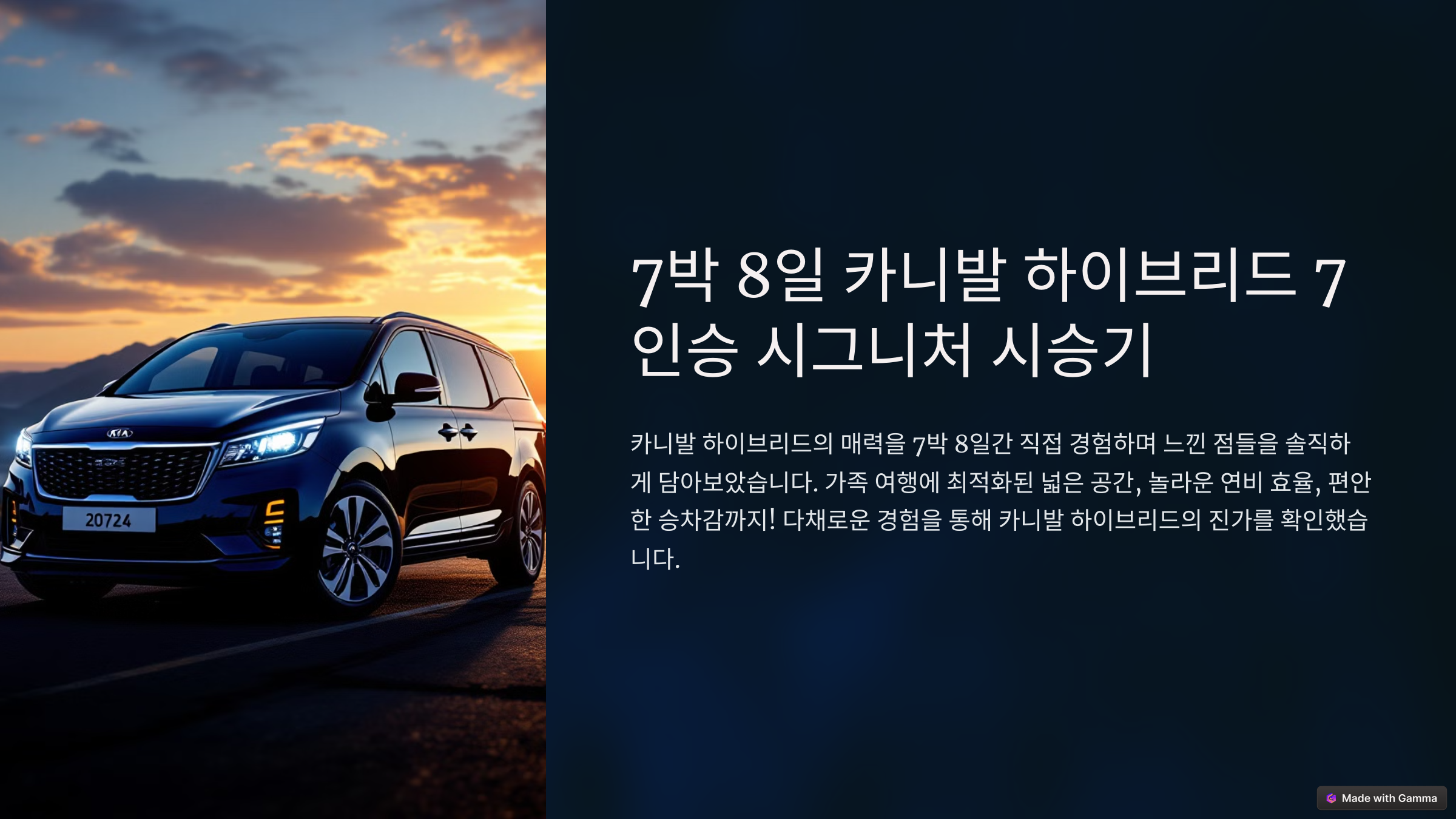 카니발 하이브리드는 기존 카니발의 공간성과 실용성을 그대로 유지하면서 하이브리드 시스템을 더해 연비와 성능을 개선한 모델입니다. 7박 8일 동안 이 차량을 직접 운행하면서 도심 주행, 고속도로 주행, 장거리 이동 등 다양한 환경에서 테스트해 보았습니다. 특히 가족과 함께하는 여행에서 얼마나 편리한지, 연비는 얼마나 절약되는지, 그리고 하이브리드 시스템이 실제 운행에서 어떻게 작동하는지 꼼꼼하게 살펴보았습니다.