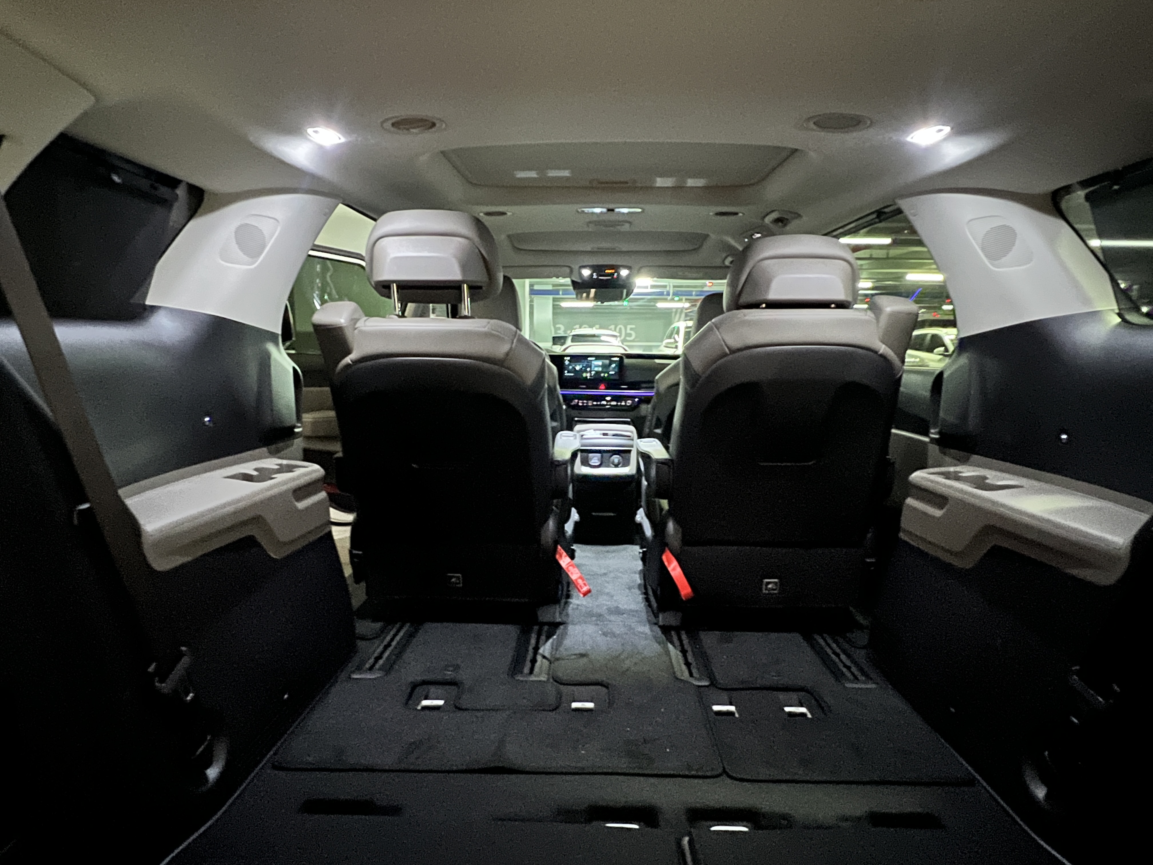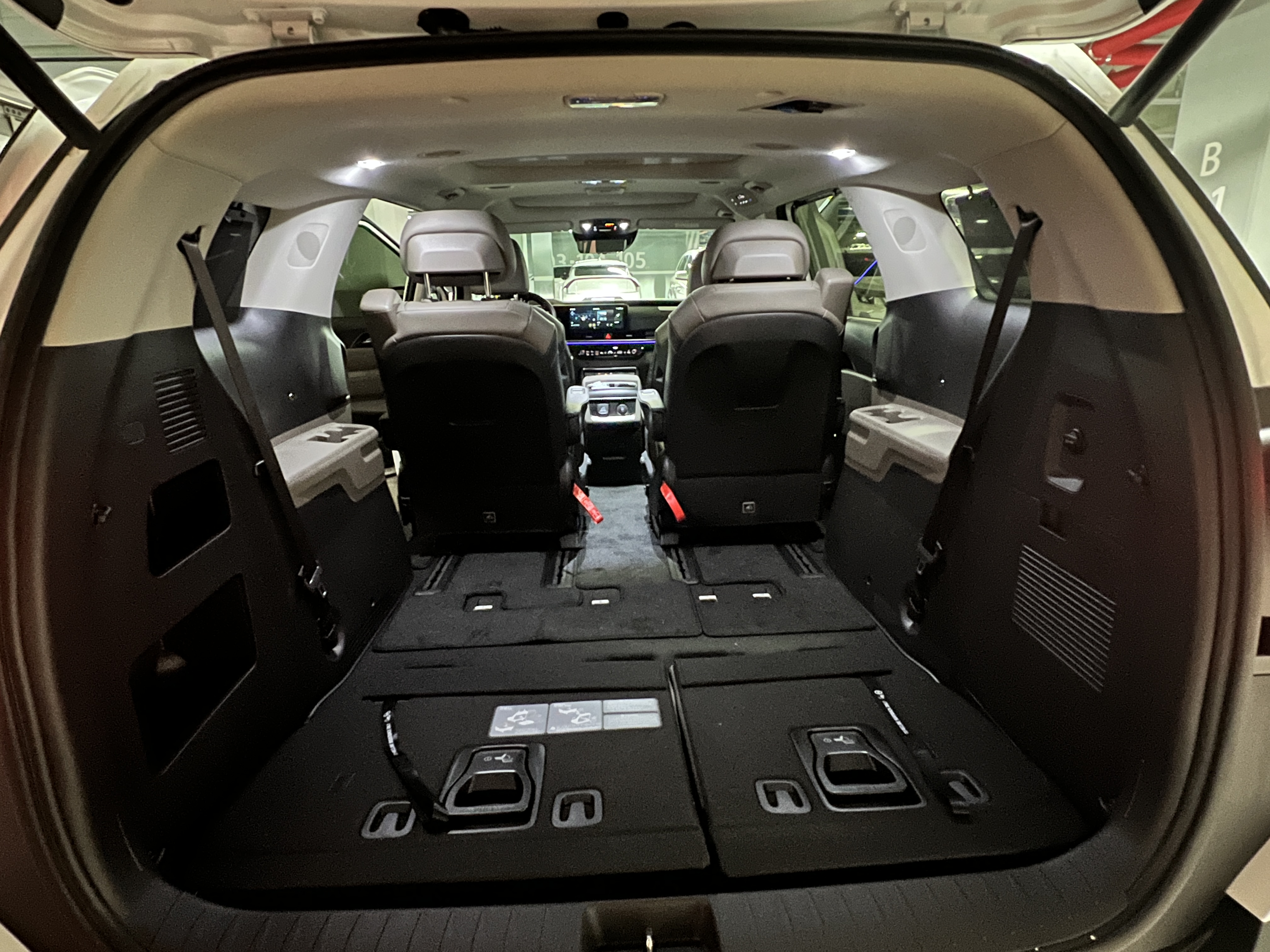 먼저, 다양한 수납공간이 마련되어 있어 가족 여행에 최적화되어 있었습니다. 1열과 2열에는 컵홀더와 스마트폰을 놓을 수 있는 공간이 충분했고, 센터 콘솔 수납함도 커서 간식이나 작은 물품을 보관하기에 편리했습니다. 또한 3열 좌석을 접으면 넓은 적재 공간이 확보되어 대형 캐리어와 캠핑 장비 등을 여유롭게 실을 수 있었습니다.