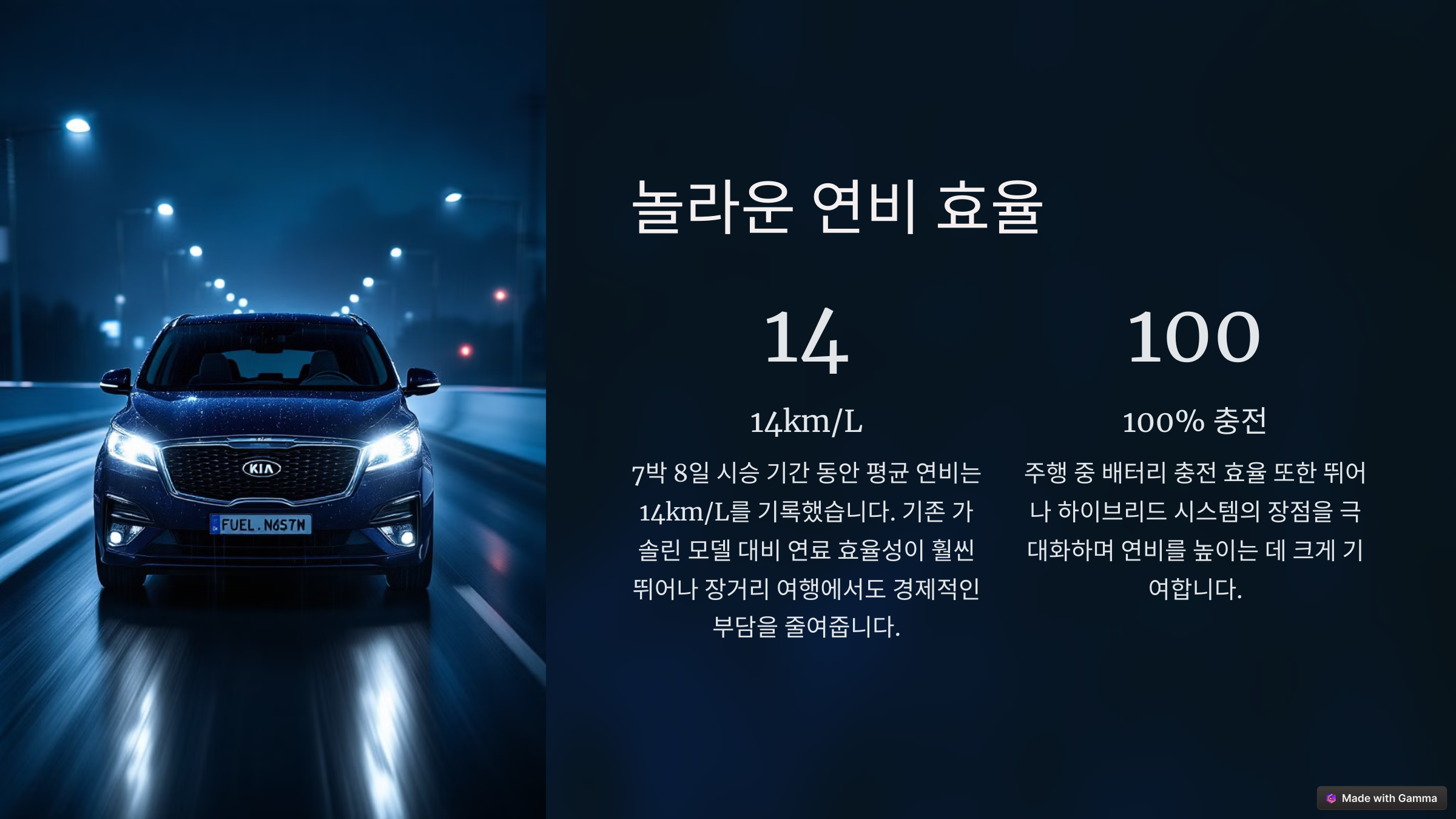 7박 8일 동안 약 1,000km를 주행하면서 연비를 측정해 보았습니다. 시내 주행과 고속도록 주행을 50:50으로 하였으며, 시내 주행에서는 약 13~14km/L, 고속도로에서는 14~15km/L 수준을 기록하였습니다. 이는 기존 내연기관 모델보다 약 30~40% 향상된 수치로, 장거리 주행에서 상당한 연료비 절감 효과를 볼 수 있습니다.