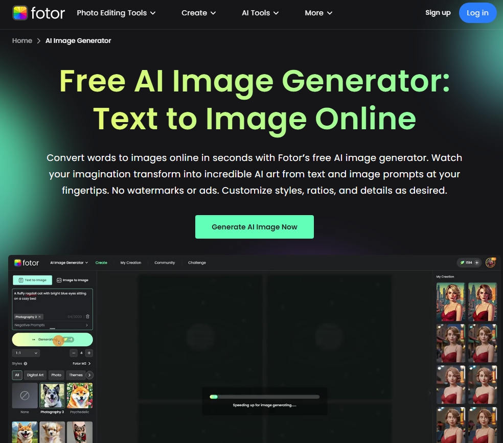 Fotor AI는 간단한 인터페이스를 통해 사진 편집과 AI 이미지 생성을 지원합니다.